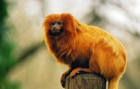 The golden lion tamarin gets its name from its fiery orange or red pelage and the extra long hairs that form along its cheek, throat and ears, giving it a distinctive mane. Its face is dark and hairless. It is believed that the hair color of the tamarin is due to exposure to sunlight or the carotenoids in its diet.